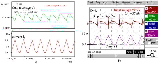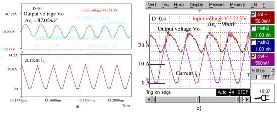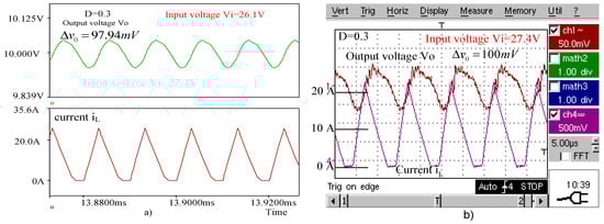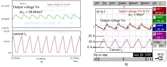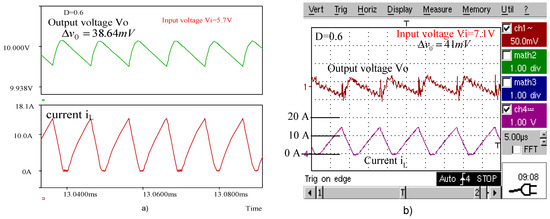 Figure 7a,b present the waveforms of the output voltage and inductor current obtained for the buck converter by simulation and by experimental tests, respectively, when operating with a duty cycle . The same waveforms are given in Figure 8a,b for , in Figure 9a,b for , and in Figure 10a,b for .