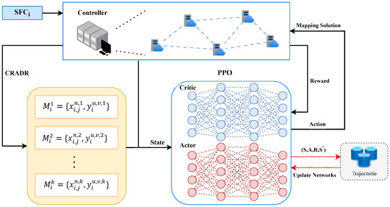 We use a Proximal Policy Optimization (PPO)-based DRL algorithm to make deployment plan decisions for SFCs [20]. Proximal Policy Optimization is a policy-gradient-based deep reinforcement learning algorithm that is widely used to solve complex decision optimization problems. PPO introduces a clipping mechanism to control the change in policies during updates effectively, ensuring stability and efficiency in policy updates. PPO employs an Actor–Critic architecture, which includes two core neural networks: an Actor network and a Critic network. The Actor network is responsible for generating a probability distribution of actions, while the Critic network estimates the value of the current state.