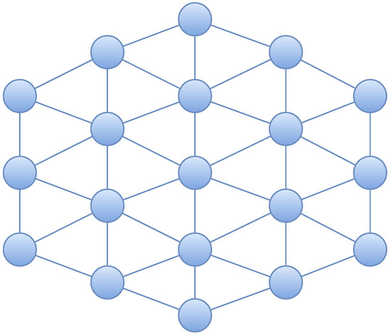 The simulation experiments were conducted using SFCSim [21], an open-source service function chain orchestration simulation tool, which is built on the NetworkX network simulation library. The simulation employed a cellular network topology, as shown in Figure 3. The cellular network contains 19 nodes and 42 links, with each node capable of establishing links with its neighboring nodes. Each network node is accompanied by an edge computing node with 80 CPU cores. The link bandwidth between nodes is 1 Gbps, the propagation delay is 0.4 ms, and the transmission delay for a single packet is 0.2 ms.