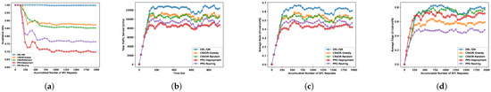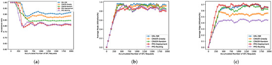 As shown in Figure 4, we evaluate the performance of the DRL-FJM algorithm under balanced network resource conditions. Figure 4a shows the acceptance ratio of SFC requests as they arrive sequentially. It can be observed that, when the number of SFC arrivals reaches 2000, CRADR-Random and CRADR-Greedy outperform the DRL-based node and link mapping algorithms, indicating that the CRADR approach effectively considers both computational and bandwidth resources, enabling a more reasonable end-to-end SFC deployment solution. Furthermore, the DRL-FJM algorithm dynamically perceives resource and latency conditions in the network, selecting a more optimal SFC deployment solution, achieving an acceptance rate close to 100%, which is superior to CRADR-Greedy (89%) and CRADR-Random (85%). This high acceptance ratio is not an isolated result. As demonstrated in Figure 5, Figure 6, Figure 7 and Figure 8, DRL-FJM consistently demonstrates superior adaptability and resource awareness under varying constraints and traffic patterns. These results jointly confirm that the excellent acceptance performance observed in Figure 4 reflects a robust and generalizable policy, rather than case-specific overfitting. This demonstrates the effectiveness of the neural network structure and reinforcement learning’s feature extraction and decision-making capabilities in DRL-FJM for improving deployment outcomes.
