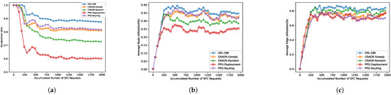 Furthermore, DRL is implemented using PyTorch 2.2.1, and the relevant parameter settings are shown in Table 1. The Actor and Critic networks are built using three fully connected layers, with ReLU activation functions. The learning rates for the Actor and Critic networks were selected empirically. A higher learning rate was used for the Actor network to facilitate efficient policy exploration, while a lower rate for the Critic network ensured stable and accurate value estimation. This configuration aligns with common settings in Actor–Critic reinforcement learning methods. In testing phase, we evaluate the performance using 2000 SFC requests.