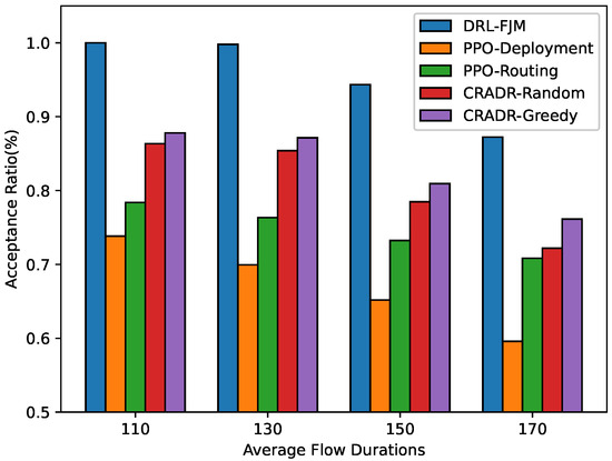 We also examine the impact of different average SFC arrival rates and flow durations, as shown in Figure 7 and Figure 8. As the arrival rate increases, the SFC acceptance ratio gradually decreases. It is noteworthy that increasing the average SFC arrival rate and average flow duration has a similar effect on the acceptance ratio. This is because, assuming sufficient computing and bandwidth resources, Little’s Law indicates that the expected number of SFCs present in the network at each time slot is proportional to the product of the average arrival rate and average flow duration. Thus, increasing these parameters results in a greater number of pending SFCs, leading to resource shortages and a decrease in new SFC acceptance. Our DRL-FJM algorithm outperforms other algorithms under different SFC arrival rates and flow durations, demonstrating superior performance and robustness.