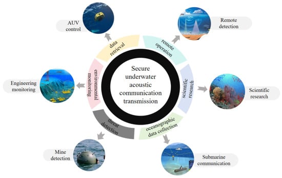 In recent years, researchers have addressed UAC security through cryptography, focusing on authentication and encryption to mitigate challenges like Doppler shift-induced key synchronization errors and multipath fading-induced data corruption [,]. However, most existing research focuses on a single technology path and lacks synergistic optimization and performance evaluation of multi-level security mechanisms [,,]. In this paper, we systematically review advancements in secure transmission technologies for underwater communication, focusing on three core areas: authentication, encryption, and cryptographic synchronization. We analyze their technical principles, performance limits, and application scenarios in depth. By evaluating the strengths and weaknesses of existing schemes, this paper identifies current technical bottlenecks and outlines future development directions. This paper aims to provide theoretical support and technical guidance for building secure UAC for UUVs. It seeks to advance the shift from single optimization to integrated synergy in underwater communication security technologies, ensuring the reliable operation and data security of unmanned marine intelligent equipment.