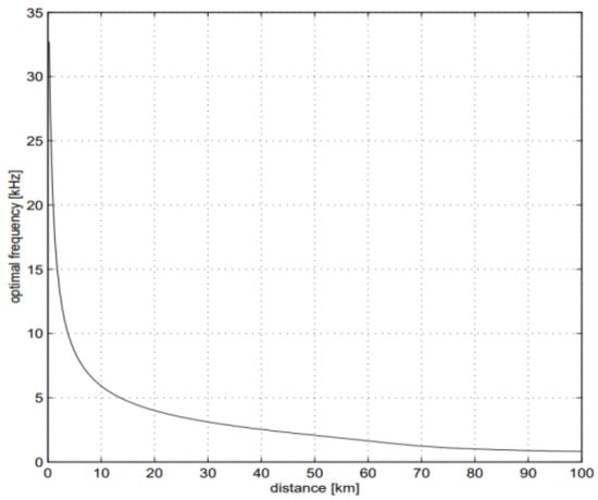 Large time delay. Terrestrial radio waves propagate in air at a speed slightly lower than the speed of light. However, the propagation speed of acoustic waves in water is merely 1.5 × 103 m/s, approximately five orders of magnitude lower than that of radio signals []. This significant speed difference results in a substantial time delay during underwater propagation []. The relationship between the signal frequency and the transmission distance is presented in Figure 3. In addition, UAC has time-varying characteristics, and its propagation speed is significantly affected by physical factors such as seawater pressure, temperature, and salinity.