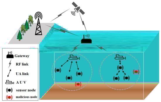 - Liang, K. Research on Malicious Node Identification Technology in Underwater Sensor Networks Based on Trust Model. Master’s Thesis, Hainan University, Haikou, China, 2022. [Google Scholar]