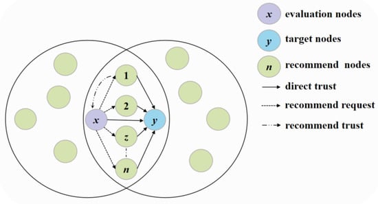 Existing authentication protocols ensure node identity legitimacy through encryption and biometric techniques, but their static nature struggles to address dynamic underwater threats like internally compromised nodes, such as malicious packet forwarding, and behavioral drift from energy depletion or environmental fluctuations. To unify trust model evaluation, it is essential to contextualize techniques against specific attack scenarios and quantifiable metrics. Key scenarios include selective forwarding attacks, where nodes disrupt packet transmission. Hybrid attacks combine data tampering and sinkhole tactics. Environmental interference includes signal degradation from water flow or node mobility. Critical metrics for UWSNs include malicious node detection rate, such as models with ≥90% accuracy. False positive rate should ideally be under 5%. Computational overhead is measured by energy use or processing time. Environmental adaptability refers to reliability in changing conditions like channel noise. Trust evaluation provides a mathematical framework to quantify node trustworthiness via pre-interaction analysis, with higher values indicating greater reliability. As shown in Figure 6, sensor nodes are classified into evaluation, target, intermediate, and recommendation roles to form trust relationship foundations. Trust models act as dynamic security layers, continuously assessing multi-dimensional metrics like communication behavior, data consistency, and energy status to build fine-grained assessment systems.