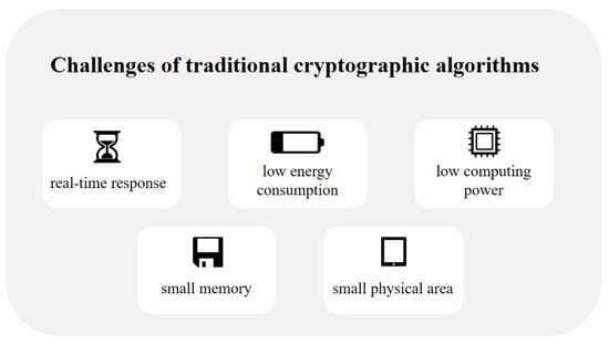 IoT devices in UUVs (e.g., AUVs, ROVs, etc.) are resource-constrained [] and characterized by small memory, low computational power, limited battery power, small physical space, and vulnerability to attacks []. In addition, most of the IoT devices in UAC need to process data in real time and exchange data frequently between devices, resulting in data facing high information security risks []. In this context, cryptographic algorithms become one of the effective methods to protect the communication security of underwater IoT devices. However, as shown in Figure 7, traditional cryptographic algorithms face many challenges when deployed on resource-constrained devices. For this reason, the researchers proposed lightweight cryptographic algorithms to achieve real-time response on resource-constrained devices and meet their security requirements by optimizing storage space, reducing power consumption, and improving computational speed, among other features. For the uniqueness and limitations of underwater communication devices, it is crucial to design lightweight cryptographic algorithms. Modern cryptography is mainly categorized into symmetric cryptographic algorithms and public key cryptographic algorithms, which will be reviewed and introduced in the following.