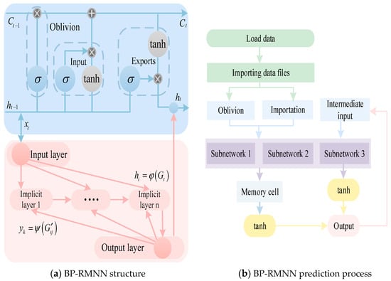 Utilizing Equation (8), the artificial recurrent network is fused with the components of the LSTM network, and the prediction speed and accuracy are further improved by modifying the number of memory nodes and hidden layers, thereby obtaining a recurrent memory neural network (RMNN) model with a higher prediction accuracy. The architecture of the optimized recurrent memory network and its prediction process are depicted in Figure 2a,b.