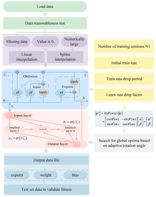 During the data preparation phase, the load data serve as the input for the forecasting model and act fundamentally as a time series. To ensure data quality and integrity, a preliminary inspection of the load data is conducted. Missing values and zero entries can be addressed with interpolation techniques such as linear interpolation or spline interpolation. Additionally, outliers or excessively large values can be managed through normalization or truncation methods to improve data consistency and enhance model performance. In the BP-RMNN, the input layer receives preprocessed data, while the hidden layer consists of multiple neurons that utilize the tanh activation function to introduce nonlinearity. The output layer generates the model’s prediction results. To enhance forecasting performance, an optimization algorithm is employed to adaptively search for the global optimum by adjusting the model parameters through rotational angle optimization.