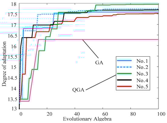 The combination of quantum genetic algorithms with optimization methods has greatly improved global search ability and convergence speed. Adding quantum behavior to the squirrel search algorithm (SSA) through quantum state-dependent position updates helps solve the problem of premature convergence in standard SSA models []. Also, the hybrid quantum–classical system that pairs QGA with quantum gate circuit neural networks (QGCNNs) shows better parallel computing power. This new design is especially good at solving complex optimization problems with uncertainty and ambiguity []. These advances show that the QGA is very effective at global optimization and fast searching, making it a strong tool for demanding optimization tasks.