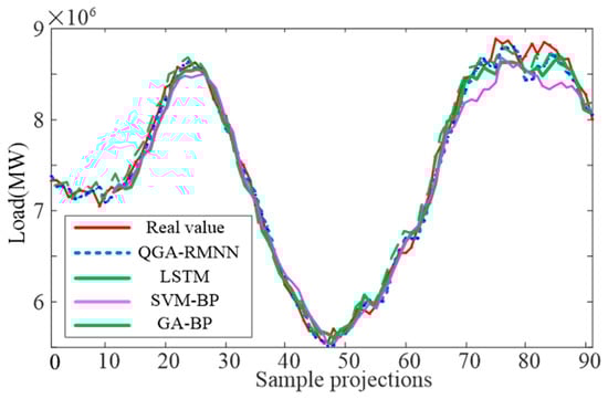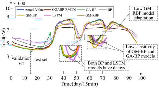 The load forecasting performance of the QGA-RMNN method is illustrated in Figure 5. To demonstrate the innovation and value of the proposed model, as well as to validate the optimization effects of quantum genetic algorithms and artificial intelligence, this study compares the proposed QGA-RMNN model with five other models—the BP network model optimized by genetic algorithm (GA-BP) [], the classical LSTM model, the BP network model based on gray theory (GM-BP) [,], the BP network model optimized by genetic algorithm [], and the hybrid model based on Gaussian mixture model and radial basis function (GM-RBF) []. The evaluation of these algorithms’ predictive capabilities is carried out through technical indicators.