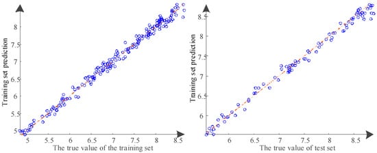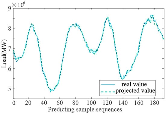 The data for Case Study 2 come from the Elia grid load in Belgium, Europe. The sampling interval is 15 min, resulting in 96 load sampling points per day. The daily data are transformed into a 96-dimensional input load matrix. The time for each sampling point is used as a dimension. Central European Time (CET) is applied as the time series value. The training set has a sequence length of 192, while the testing set has a length of 96. A sliding window strategy with a dimension of 15 (equivalent to 225 min) is used during the prediction phase. The prediction accuracy for the training and testing sets is shown in Figure 6 and Figure 7, respectively.