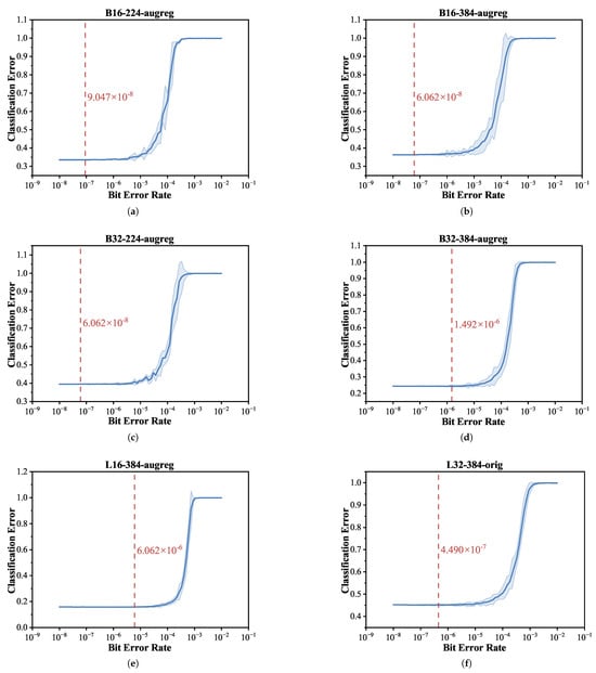 Table 5 presents the accuracy loss across different models at various BER thresholds, specifically when the classification error loss reached 1%, 5%, and 10%. The general trend is that larger models with smaller patches tend to be more robust, while all models’ errors increase significantly beyond a certain threshold of BER. These trends are consistent with the data collected through more than 70 h of neutron beam experiments [].