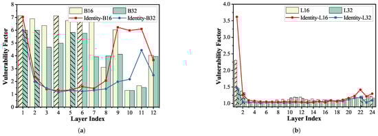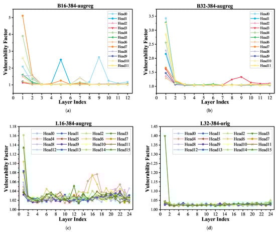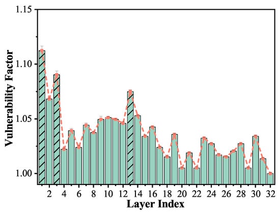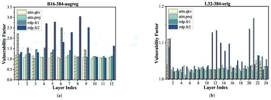 In this section, the importance of individual layers in different ViT models is evaluated by introducing the same BER. Each layer in a ViT model consists of multiple sub-blocks, as outlined in Table 1, such as the attn.qkv, attn.proj, mlp.fc1 and mlp.fc2. According to the settings of BER, we randomly selected weights from the weight matrices of these sub-blocks, such as , , , and and injected bit-flip faults to the chosen weights; then, we ran the model and determined the classification accuracy with errors. This scenario was repeated 10 times for each layer from the first to the last, and the average vulnerability factor was used to quantify the sensitivity of each layer to weight perturbations.