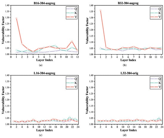 Layer-wise vulnerability factor analysis of Q, K, V projection matrices in the self-attention mechanism. Base models (B16/B32) exhibit clear vulnerability peaks in the V matrix at Layer 1, while large models (L16/L32) show low and uniform sensitivity across all layers: (a) B16-384-augreg (error bar up to 0.0065); (b) B32-384-augreg (error bar up to 0.0072); (c) L16-384-augreg (error bar up to 0.0693); (d) L32-384-orig (error bar up to 0.0093).