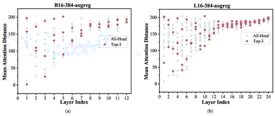 To further investigate and understand how different heads in different layers affect the models’ accuracy, we calculated the mean attention distance (MAD) [] of the three most vulnerable attention heads in each layer. The MAD refers to the average spatial distance (pixels or patches) between a given query patch and the key patches it attends to in the self-attention mechanism. It quantifies how “far” the model’s attention head looks when aggregating information across the input image.