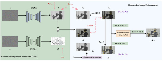 Inspired by the RetinexDIP method, we combine the Retinex image enhancement theory and deep learning techniques to obtain the illumination and reflection components in the model. As illustrated in Figure 2, the proposed algorithm comprises two core modules: Retinex Decomposition based on CGNet and Illumination Image Enhancement.