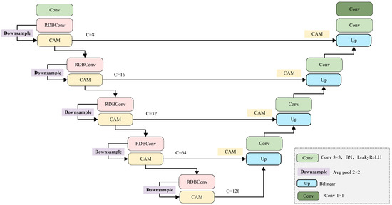 To overcome the above problems, we developed CGNet, a Component Generation Network built upon a modified UNet encoder–decoder architecture. As illustrated in Figure 3, the proposed network enhances the standard UNet framework through two key innovations: the RDBConv and the CAM. These measures effectively enhance the network’s ability to learn image features, enabling it to generate more realistic illumination and reflection components.