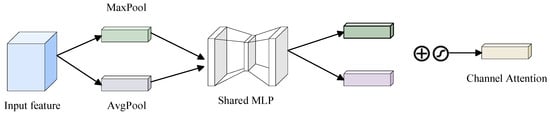 In UNet architecture, the downsampling process plays a pivotal role in shaping feature representation capabilities. This study introduces the CAM during the downsampling phase, and its structure is illustrated in Figure 5. The mechanism employs parallel global max-pooling and average-pooling operations to capture global statistical characteristics of feature channels, followed by a multilayer perceptron (MLP) to model nonlinear interdependencies among channels, thereby generating discriminative channel attention weights. This design enables dynamic modulation of channel-wise contributions during downsampling: it automatically enhances high-frequency detail features critical for image reconstruction while effectively suppressing interference from noisy or redundant channels. Such attention-guided downsampling not only preserves richer semantic information but also establishes a robust foundation for subsequent feature fusion.