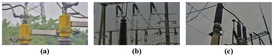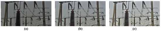 Figure 6 shows examples of external inspection of electrical equipment images under different lighting conditions, including backlit and twilight scenarios. Subfigure (a) displays a properly illuminated scene where the threads and colors of a disconnect switch are clearly visible. In contrast, subfigure (b) presents an underexposed scenario where the edges of a bushing appear blurred with indistinguishable color information, and subfigure (c) shows an image taken from an upward perspective, where insufficient light intake results in poor visibility of neutral equipment. For algorithm validation, we selected 85 images from the organized external inspection of electrical equipment image dataset to establish the experimental dataset, designated as the Low-Illumination External Inspection of Electrical Equipment (LIEE) Dataset. Additionally, part of the LIEE dataset can be available at: https://github.com/Fancin/CGNet_Image_Enhancement (accessed on 12 May 2025).