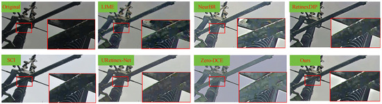To verify the effect of the algorithm proposed in external inspection of electrical equipment, we conducted a comparative analysis with several widely used image enhancement methods, most of which operate without reference images. The benchmark methods include LIME [27], NeurBR [28], RetinexDIP [23], SCI [29], URetinex-Net [30], and Zero-DCE [19]. The parameter settings of the network models used in these methods all use default parameter values and provided weight values.
