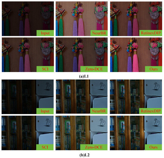 Additionally, we choose the LOL dataset containing “ideal image-low light image” pairs to evaluate the performance of different algorithms in terms of PSNR and SSIM. The test results in Table 6 show that our algorithm achieved preferable results in LOL dataset. Additionally, we select L1 and L2 from LOL dataset to make subjective comparisons. As shown in Figure 10, the enhanced images by our method achieve the best texture sharpness and natural color.