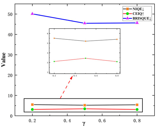 In this section, we discuss the key parameters of our model, focusing on the weighting of the loss functions and the selection of the gamma value for gamma correction. As shown in Equation (7), based on the experience from Retinex-based image enhancement methods, and are very important in the model, so we set the weight of and as 1 (). Next, we will discuss the weights of and , i.e., and .