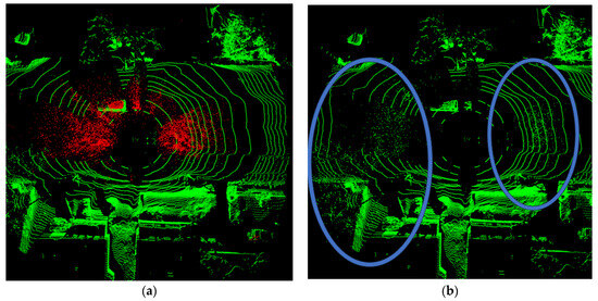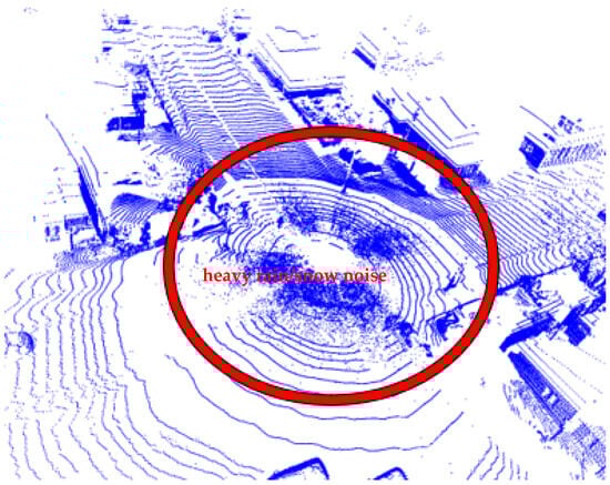 Although LiDAR has benefits, adverse weather conditions can affect its performance. This can cause the sensor to generate large amounts of erroneous data, leading to misjudgments by the autonomous driving system. Heavy rain, snow, and fog can cause the laser beam to reflect or scatter prematurely, resulting in misjudgment by the sensor and a reduction in its operating range and reliability. Figure 1 illustrates the interference with LiDAR in heavy rain/snow conditions.