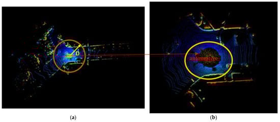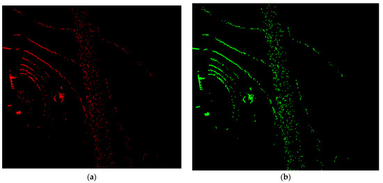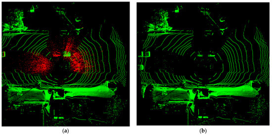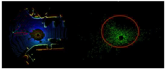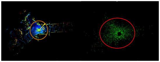 Compared to the complete point cloud, the circle includes all the noise points and some normal environment objects, as shown in Figure 3 and Figure 4. The noises within these two figures are nearly the same. This meets the training requirements for the point cloud denoising task, ensures a consistent input size, reduces training requirements, and maximizes the preservation of the noise points. Specific data on data reduction are shown in Table 1. This ensures that the neural network can fully learn the characteristics of the noise points during subsequent training. In subsequent training, the neural network learns the characteristics of the noise points to the greatest extent possible.