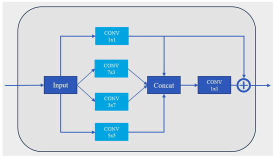 The inception structure employs multi-scale convolutional kernels to effectively capture features at different scales, improving the model’s ability to recognize objects of varying sizes. Four types of convolution kernels were used: [1 × 1], [7 × 3], [5 × 5], and [3 × 7]. The [3 × 7] and [7 × 3] kernels have non-traditional lengths to accommodate inputs with varying dimensions, such as those with a larger difference between length and width. The [5 × 5] kernel is of a traditional size and is used for regular inputs.