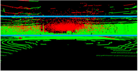 Three parameters from the Lidar system are input into the network: distance, reflection intensity, and laser ID. The traditional method only utilizes distance and reflection intensity. However, after observing different datasets, we found that most of the noise points are distributed in a fixed area, as shown in Figure 6. The laser ID parameter can represent the relative height position of the point cloud. Through the input of this parameter into the network, it can learn additional features and focus on positions where noise points are more likely to appear, resulting in more effective noise identification.