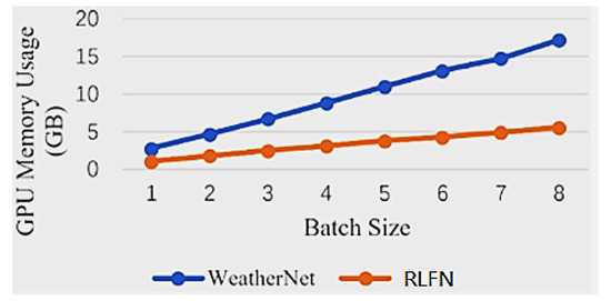 In comparison to WeatherNet’s 1.6 M parameters, the proposed network has only 344 k parameters. Table 3 and Figure 8 display the hardware usage of various batch sizes during training. It is evident that the proposed network significantly reduces GPU memory usage. This enables the network to be trained and deployed on lower-specification hardware.
