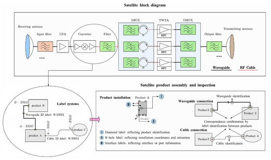 There is a label system mainly consisting of diamond labels, R-hole labels, and interface labels on the products of the high-throughput satellite payload module, as shown in Figure 1. With the help of the text information on these labels, automatic assembly inspection of payload module products via these labels is feasible. Among them, the diamond label indicates the identity information of the individual product, the R-hole label indicates the position of the reference hole and the assembly orientation of the individual product, and the interface label indicates the waveguide/cable connected to the individual product interface.