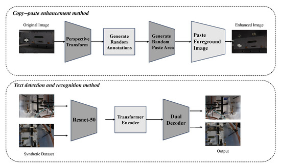 Our goal is to develop an automated assembly inspection framework. To address the challenges of limited data and text deformation, we have designed the following framework. Our framework consists of two parts. First, we design the copy–paste enhancement method on simulated data to solve the problem of scarce training samples. Then, we design a text detection and recognition method, train the model with the generated large amount of simulated data, and fine-tune the trained model based on a small amount of actual collected data to reduce the impact of data distribution differences on model performance. Overall, this section will be divided into two parts, which will discuss in detail the data augmentation method used to generate data and briefly introduce the text detection and recognition method used for training. The overall flow chart is shown in Figure 3.