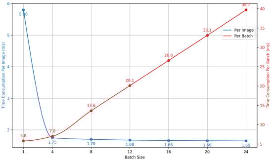 With the testing environment specified in Section 5.5, we have evaluated the end-to-end latency of processing each object when deployed in three different ways. Each input image is processed by two YOLO models—one for crack detection and one for hole detection. As demonstrated in Figure 2, we evaluated three batching deployment strategies: