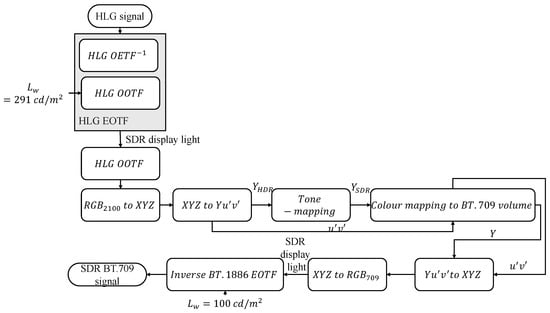 In this method, initially, the HLG signal is passed from HLG EOTF to obtain the SDR display light, and then the RGB of Recommendation BT.2100 is converted to XYZ, which is converted to Y u v colour space. After this conversion, the tone mapping is applied to Y H D R to obtain Y S D R , which is passed to the colour mapping block, whereas u v are directly given as another input to the colour mapping block. This block performs gamut volume compression to BT.709 volume, and the resulting Yu′v′ is converted back to XYZ to obtain the SDR display light. This SDR display light is further passed from the inverse BT.1886 EOTF [18] with a peak luminance of 100 cd/m2 to obtain an SDR BT.709 signal. The flow diagram of this method is shown in Figure 2, and further detailed information can be obtained from [9].