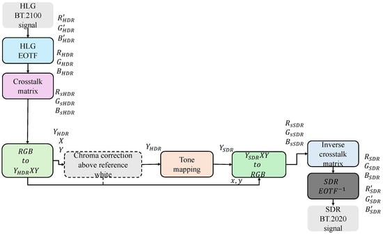 In this method, the HLG BT.2100 signal is given as input to the HLG EOTF, which yields the non-linear RGB of HDR. Then, the cross-talk matrix is applied to obtain the standard RGB of HDR. These RGBs are converted to Y H D R X Y after that, chroma correction above reference white is applied to obtain Y H D R , and then tone mapping is applied to obtain Y S D R . After tone mapping, Y S D R X Y is converted to the sRGB of SDR, and the inverse cross-talk matrix is applied to obtain non-linear RGB, followed by the inverse EOTF to obtain a linear SDR BT.2020 signal [19]. This signal was further converted to a BT.709 signal for displaying on an SDR display of the lab. All these steps are shown in the flow diagram in Figure 3 and are described in detail in [9].