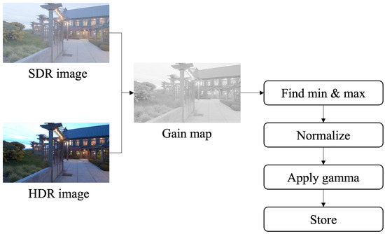 In the plenary session on “Embedded Gain Maps for Adaptive Display of High Dynamic Range Images” by Eric Chan and Paul M. Hubel [15], the researchers demonstrated the steps to find gain maps if the SDR and HDR renditions are known. Gain maps can be quotient gain maps, which are calculated by dividing HDR images by SDR, as these can be logarithmic-based. These gain maps are basically calculated in the linear colour space with gamma encoding of 1.0, and the formula is presented in Equation (1). These gain maps can be encoded in the header of the file as specified by the researchers from Apple in ISO/WD 21496-1 [20]. To calculate gain maps, we used HDR images of the dataset and corresponding SDR images calculated using Method C. After finding gain maps, the minimum and maximum were calculated based on the minimum and maximum, normalization was performed, then gamma was applied, and the output was stored in the image. In our dataset, HDR images are stored in 16-bit floating point format, SDR images in 8-bit per channel, and gain maps in 16-bit floating point. The flow diagram to calculate the gain map and its metadata is shown in Figure 4.