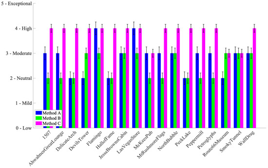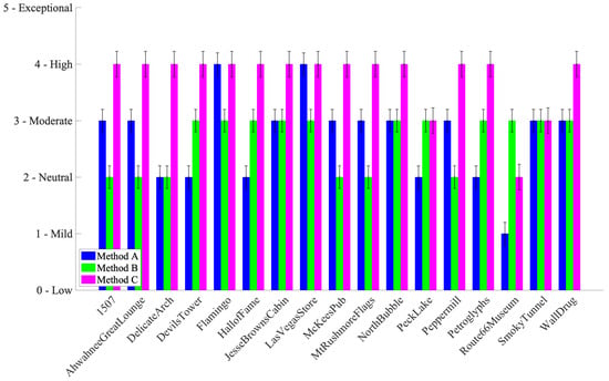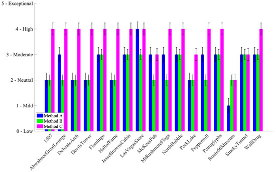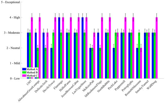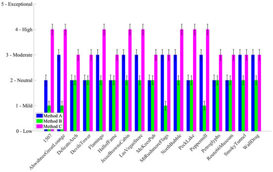 Figure 7 shows the ratings for pleasantness. Method C was generally rated highest, especially in low-light scenes, such as “Night” or “Indoor” categories. Method B occasionally matched or outperformed C in brighter scenes but was overall less consistent.