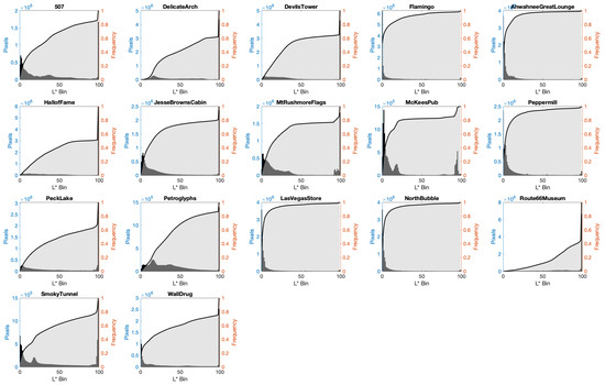 Figure 12. Lightness histograms (bars) and cumulative lightness histograms (solid grey patches) for all images.