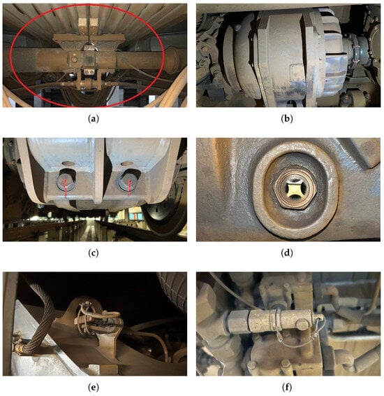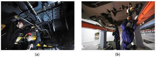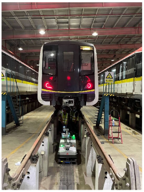 To ensure operational reliability and safety, scheduled and unscheduled inspections are essential for metro maintenance [5,6]. Currently, these inspections mainly depend on manual, periodic procedures carried out by trained maintenance staff. Manual inspections involve evaluating key systems like traction mechanisms, braking units, door operations, bogies, and pantographs. Auxiliary subsystems such as air conditioning, signaling, and power supply units are also checked. Among these, undercarriage inspection is crucial and focuses on detecting issues like missing or loose fasteners, unsecured cable connectors, compromised coupler integrity, and fluid leakage beyond safety limits. Inspections usually start around 3:00 a.m. after daily operations end. Technicians work in confined maintenance pits under metro cars, using handheld flashlights and visual inspections to assess components. A standard six-car metro requires verifying over 10,000 checkpoints per inspection cycle. However, traditional manual inspection methods have significant safety risks and operational inefficiencies. Technicians often work in confined, high-pressure environments. Inspection results can vary due to expertise, fatigue, and cognitive workload differences. Under such conditions, ensuring comprehensive and consistent assessments is challenging and increases the risk of undetected faults, which could affect metro operation safety. More importantly, fault detection and maintenance still heavily rely on traditional manual procedures and paper records, which lack effective integration with intelligent maintenance platforms. As a result, the digitization level is low. This restricts real-time condition monitoring and predictive data analytics, hindering the development of intelligent asset management systems.