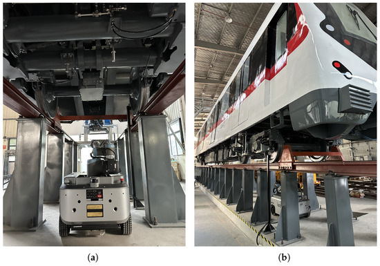 To support the development of this robot, an undercarriage inspection scenario was independently constructed, as shown in Figure 5. The scenario incorporates an actual metro vehicle and precisely replicates the depot pit environment, faithfully simulating real-world maintenance conditions. As a result, this highly realistic development environment significantly enhances development efficiency and ensures that the robot can undergo comprehensive performance testing and optimization prior to field deployment.