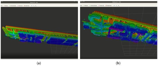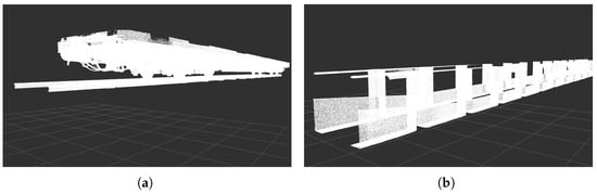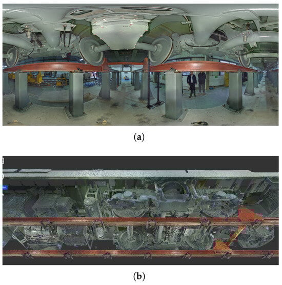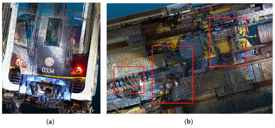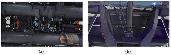 The Leica RTC360 features compact size, lightweight design, and high portability. Field experiments indicate that each scanning position requires 86 s, and a total of 20 positions are needed to cover a metro carriage and its underfloor conduits. Including equipment setup and data preprocessing, the complete scanning workflow is completed in approximately 60 min. Selected scan results are presented in Figure 8.