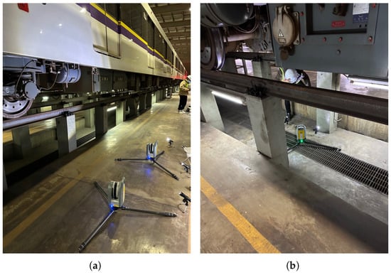 As illustrated in Figure 12, two Trimble X7 scanners were deployed in a field scenario to complete the data acquisition of six metro carriages and their associated underfloor ducts within four hours. Each scanner was equipped with four fill-light units to ensure the quality of the captured point cloud data.