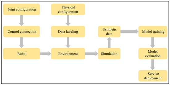 Since being introduced in industrial robotics, simulation technology has evolved from a sole path-planning tool into a comprehensive solution integrating digital twins, augmented reality, and artificial intelligence [11,12], marking a significant milestone in the shift from Industry 4.0 to Industry 5.0 [13,14]. According to the 2022 statistics from the International Federation of Robotics (IFR), over 68% of global automotive manufacturers have deployed simulation platforms based on virtual debugging [15]. An increasing number of enterprises are now establishing these platforms to validate and optimize operational workflows, thereby enhancing production line performance. For example, real-time mapping of physical robots to virtual models enables lifecycle optimization, from initial calibration to complex assembly tasks [16]. Robot simulation has made great progress in algorithm testing, control system verification, and virtual scheduling platforms. Open-source simulation platforms like Gazebo, Webots, CoppeliaSim, and Isaac Sim are widely used in various robot tasks. They help deploy complex operations and iterate optimizations in virtual environments [17,18]. Also, combining simulation with digital twin technology greatly supports the transfer of machine-learning models. This enhances the reality and generalizability of simulation systems [19,20]. Several systematic reviews indicate that research is moving from single-task simulation to system-level, multi-robot collaborative simulation. At the same time, the focus is on modeling abilities for multi-physics and multi-sensor integration environments [21].