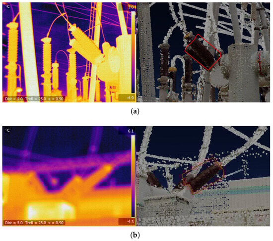 In addition, two validation experiments were carried out in this study: one was to use the robot’s camera to shoot meters, and the other was to use an infrared camera to measure the temperature of transmission equipment. These experiments further confirmed the reliability of the vectorization labeling results and the offline teaching solution. In the test of 621 infrared images and 51 visible light images, the success rate of the infrared camera reached 95%, and that of the visible light camera was 86%. The reasons for the failures mainly focused on image blurring and target deviation from the image center, most of which could be solved by optimizing the navigation point settings and adjusting the camera focus. Note that the current experiment only focuses on the success rate and efficiency of offline teaching. It does not calculate the pose deviation between reality and simulation using the acquired point cloud data and RGB images.