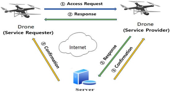 The network model for the SETKE protocol in an IoD environment consists of three entities as follows (Figure 1): a Service Requester (SR) drone, a Service Provider (SP) drone, and a trusted Control Server (S).