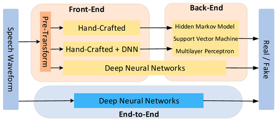 In the process of language deepfake detection technology evolution [7], detection methods have undergone a significant paradigm shift. Early research was mainly based on traditional statistical methods, such as the Hidden Markov Model (HMM) [8] and the Gaussian Mixture Model (GMM), and then gradually developed into a two-stage architecture with front-end feature extraction and back-end classifier’s collaborative processing [9,10,11,12,13]. With the breakthrough of deep learning technology, end-to-end detection schemes based on DNNs are becoming increasingly popular, using pre-transformed features as inputs [14,15,16] to achieve a deep fusion of feature learning and decision-making. In traditional voice deepfake detection systems, the front-end module is responsible for parsing acoustic representations from speech signals, while the back-end module completes the nonlinear mapping of features to detection confidence. Traditional front-end processing mostly uses digital signal processing technology. The widely used acoustic features include fundamental frequency; power spectrum; Linear Frequency Cepstrum Coefficients (LFCCs); Mel-frequency Cepstral Coefficients (MFCCs); Cepstral Mean and Variance Normalization (CMVN); Corrected Group Delay (MGD); Relative Phase Shift (RPS); spectrograms; Constant-Q Cepstral Coefficients (CQCCs); Constant-Q Transform (CQT); and other spectral features and their various variations and combinations [17,18,19,20,21]. These artificially designed features capture the time–frequency characteristics of speech signals through mathematical transformations.