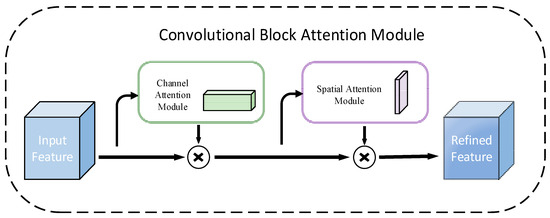 As shown in Figure 3, the CBAM module adopts a dual-branch attention mechanism design, which includes two sub-modules: channel attention and spatial attention. The input features first generate the weight distribution of the channel dimension through the channel attention module, and based on this, the input features are weighted and calibrated channel by channel; then, the calibrated features are input to the spatial attention module to further learn the saliency distribution of the spatial dimension, and finally, the optimized output features are obtained through weighted fusion. This cascade structure achieves adaptive enhancement of the original features by focusing on key information of different dimensions in stages. Its mathematical formula is as follows: