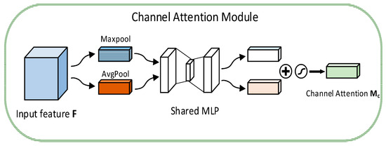 Channel Attention Module: In Figure 5, the input features are first subjected to dual-path spatial information aggregation. Average Pooling and Max Pooling operations are used to extract the average feature vector , reflecting the global distribution characteristics and the max feature vector and capturing the significant local response. Subsequently, the two types of feature vectors are input into the parameter-sharing MLP for joint learning to generate the channel-dimensional attention weight map . In the 1D channel attention, a 1D convolutional layer is used instead of the MLP, and the size of the hidden activation intermediate layer dimension is reduced to by setting the compression ratio to control the complexity of the model. Finally, the outputs of the two branches are added element by element to complete the calculation of the channel attention weight. The formula is as follows: